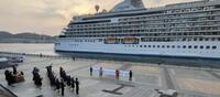 去る4月9日(火)に今年度初となる大型客船(セブンシーズ・エクスプローラー)の出港セレモニー演奏に行ってきました。前日が入学式だったこともあり、新入生も数名、松ヶ枝埠頭まで見学に来てくれました。入部してくれそうで嬉しかったです。