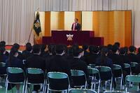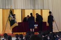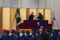 卒業式を前に63回生の同窓会入会式と特別表彰・皆勤表彰・南高顕彰を行いました。同窓会入会式では、同窓会会長 岡村康司様から歓迎の言葉と記念品をいただき、63回生198名が南高同窓会の仲間入りを果たしました。